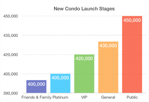 The above graph is a sample illustration of the several stages in the typical sales cycle of a new pre-construction condo project launch. These stages can include but are not limited to - the builder’s in-house friends and family, Platinum Sales, VVIP, VIP event to the general public launch, which occurs after several months of selling. Some builders don’t even sell to the general public and utilize the agent/realtor community as their main distribution channel – more the reason to partner with a front-of-the-line Platinum Agent.